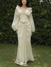 Unique Floral White V-Neck Long Sleeve Long Prom Dress Ideas, Evening