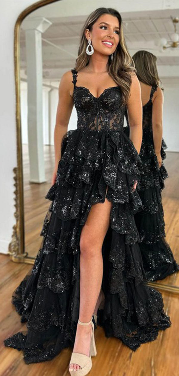 Sexy Black Spaghetti Strap High Low Long Prom Dress Ideas, Evening Par