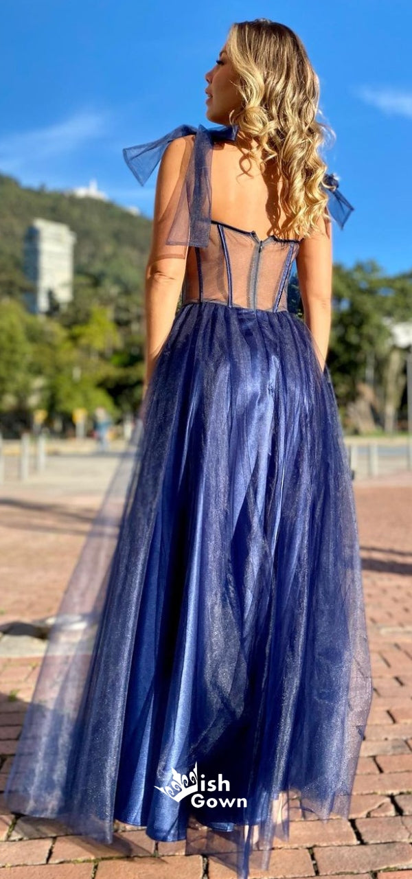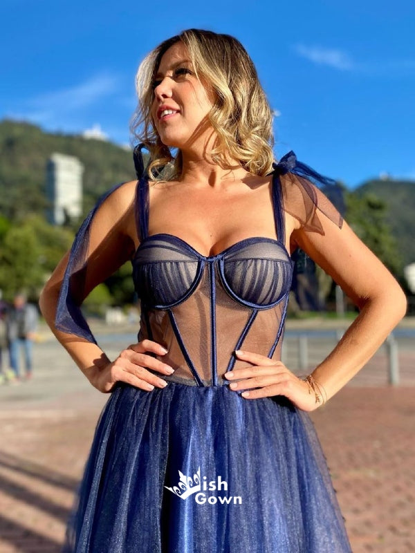 Sweetheart Lace-up Straps See Through A-line Tulle Sparkly Evening Gowns Prom Dresses , WGP159