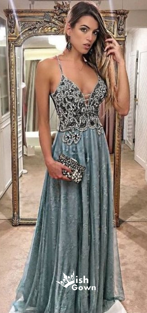 Spaghetti Straps Beaded Top Sequins Sparkly A-line Long Prom Dresses, WG1077
