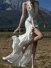 Elegant White V-Neck Mermaid Side Slit Floral Long Prom Dress Ideas, Evening Party Dresses,WGP1703