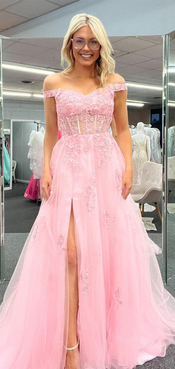 Beautiful Pink A-Line Off-shoulder Side Slit Popular Long Evening Dresses, Formal Dresses, Birthday Party, WGP565