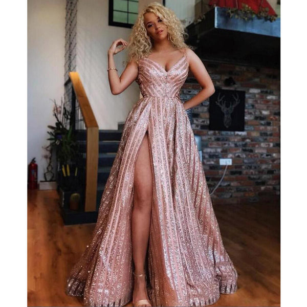 Spaghetti Strap Sparkle A Line Side Slit Long Prom Dresses, SG159