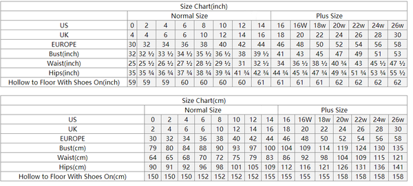 | US Size | UK Size | Bust | Waist | Hips | Hollow to Floor With Shoes On |