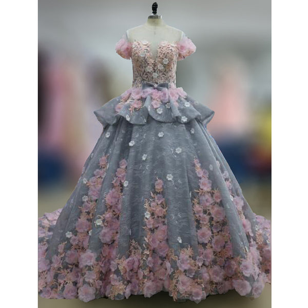Charming Cap Sleeve Affordable Long Evening Prom Dresses Ball Gown with Flowers, WG1004