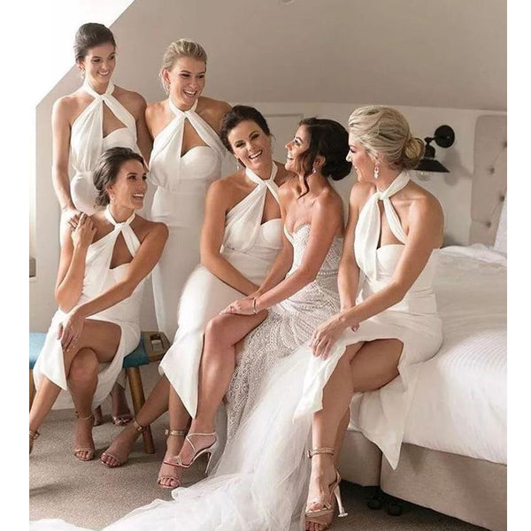 Unique Halter Sexy Cheap Side Split Teal Length Bridesmaid Dresses, WG12
