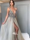 Elegant Pale Grey A-line Tulle V-neck Beaded Top Sexy Popular Long Prom Dresses, WG777