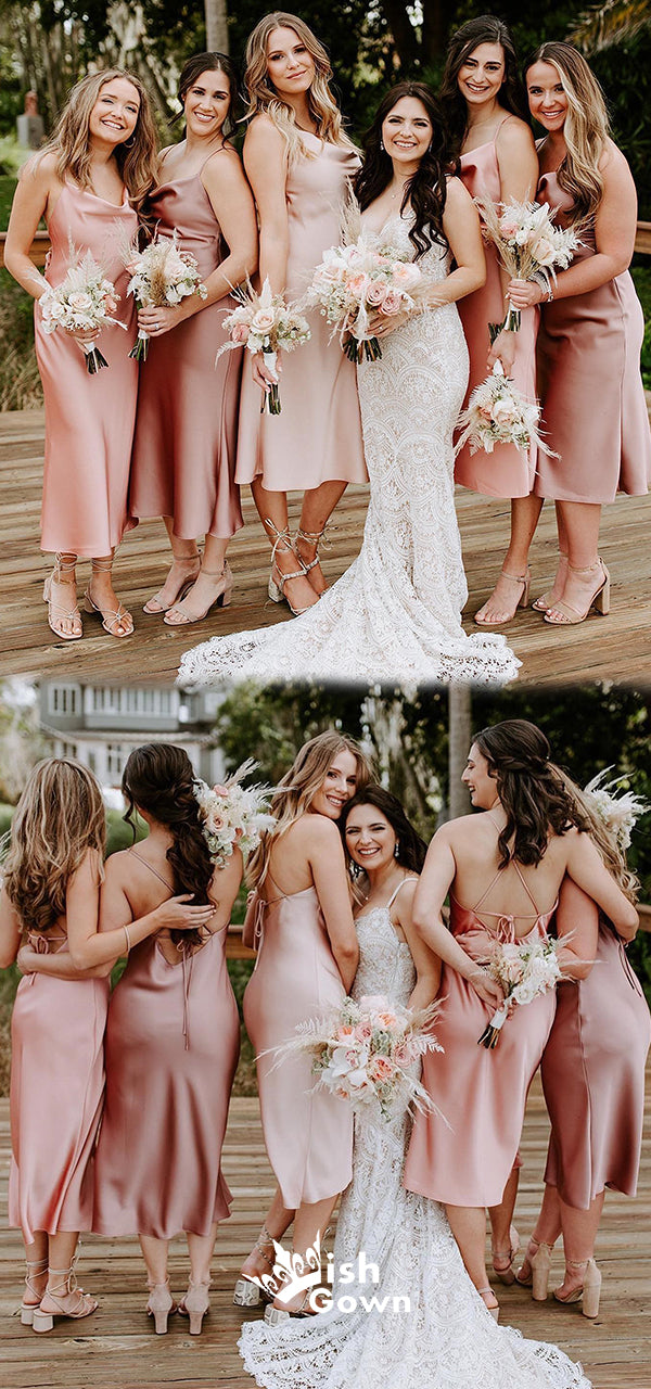 Blush Pink Chic Soft Satin Spaghetti Straps Criss Cross Sheath Bridesmaid Dresses, WGM120