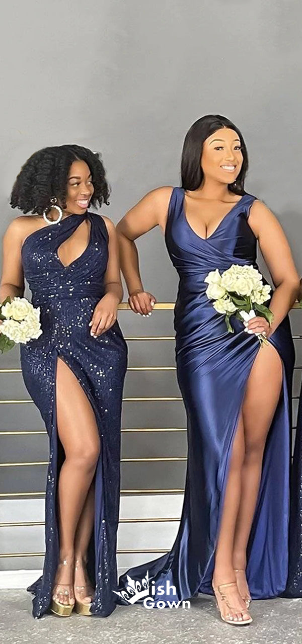 Mismatched Strapless One Shoulder Soft Satin Sequins Pleating High Slits Mermaid Long Bridesmaid Dresses, WGM122