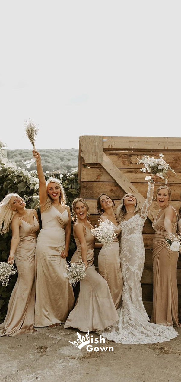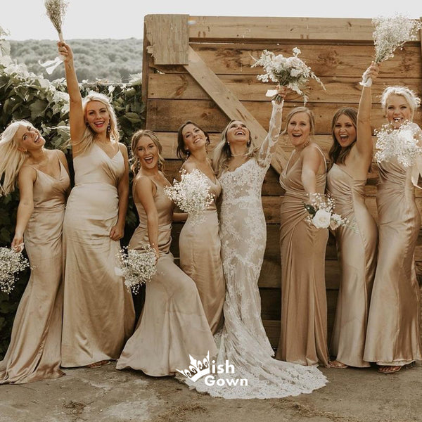 Simple Chic Spaghetti Straps Pleating V-neck Mermaid Soft Satin Long Bridesmaid Dresses, WGM124