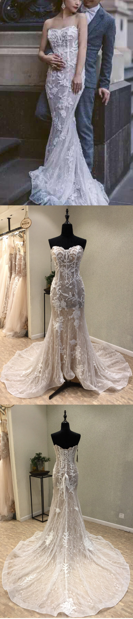Mermaid Sweetheart Lace Long Cheap Bridal Wedding Dress with Lace Up Back, WG691