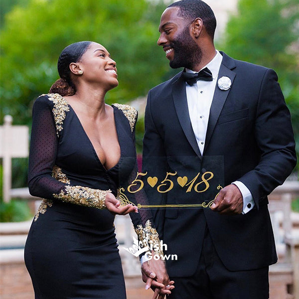 Black Satin Low Back Gold Appliques V-neck Mermaid Evening Long Prom Dress With Trailing, WGP099
