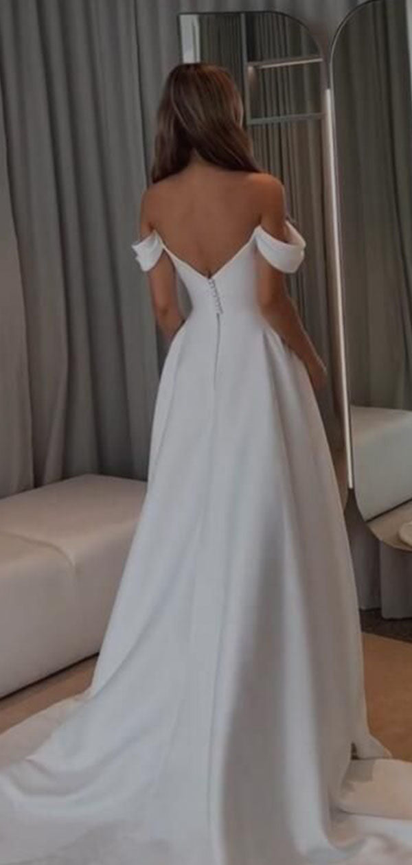 Elegant White Off-Shoulder A-Line Long Wedding Dresses With Sweep Trailing,WDH163